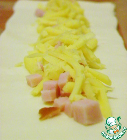 Посередине нашего теста, вдоль тонких слоев выкладываем заранее мелко порезанную ветчину и присыпаем ее тертым сыром.