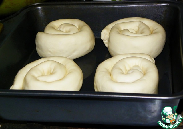 Соединяем края теста крепко, так, чтобы у нас получилась колбаска. Затем скатываем ее в улитку. Полученные улитки выкладываем на противень и отправляем выпекаться при температуре 200 градусов 20-30 минут.