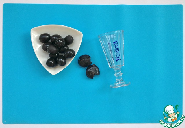 В моей семье не едят маслины без косточек, поэтому я их никогда не покупаю. Освободить маслины от косточки очень просто. Для этого нужно надавить на нее любой рюмкой, стаканом или чем-то еще. Косточка легко отделится от маслины.