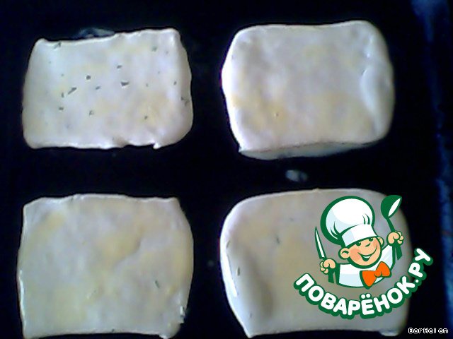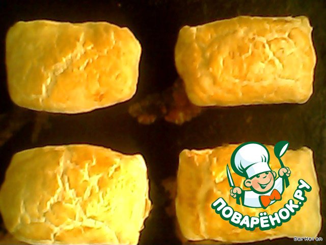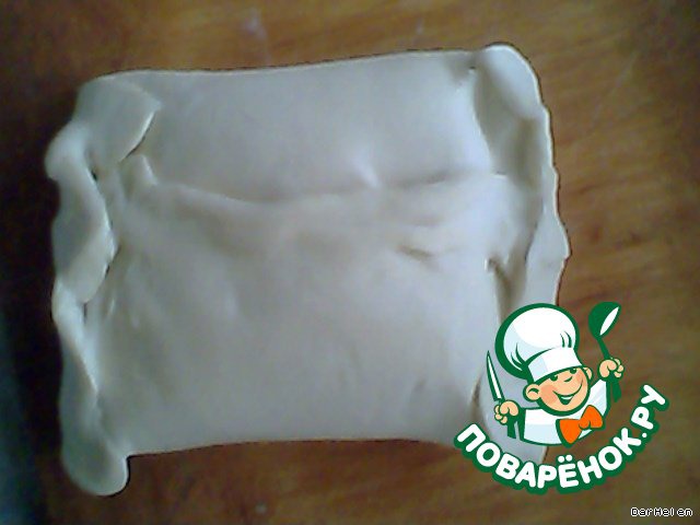 Тесто нарезаем на прямоугольники или квадраты. у меня тесто продается в виде пластов, на 1кг - 4 пласта. то есть 8 прямоугольников или 12квадратов.