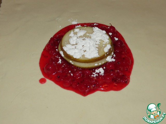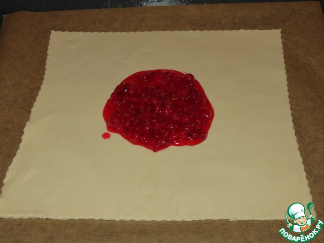 В центр раскатанной части слоеного теста положить клюквенный соус.