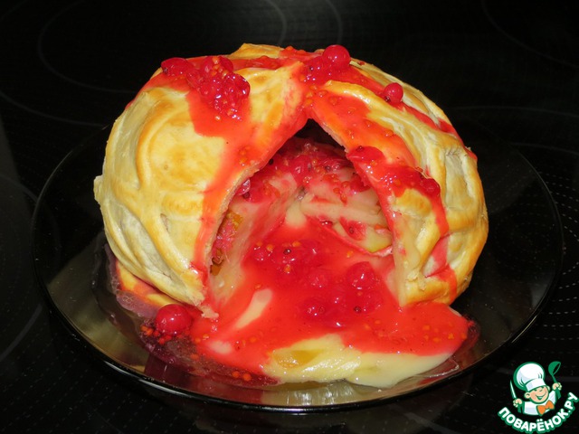 Разрезать корочку слоеного теста, позволить сыру вытечь.