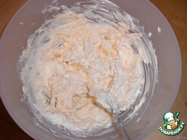 Смешать творожную смесь и тертый сыр. Начинка готова.