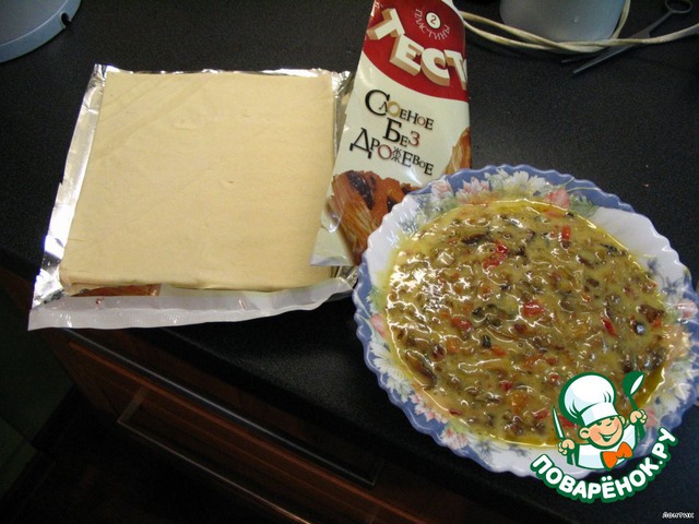 Лук, грибы, перец, ветчина измельчаются и слегка поджариваются на сковороде в перечисленной последовательности. Сильно зажаривать продукты не следует, учтите, что они еще будут выпекаться в предварительно разогретой печи, как минимум, 20 мин.