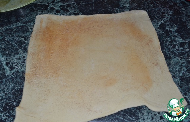 2. Предварительно размороженое тесто раскатываем и посыпаем корицей по всей поверхности теста.