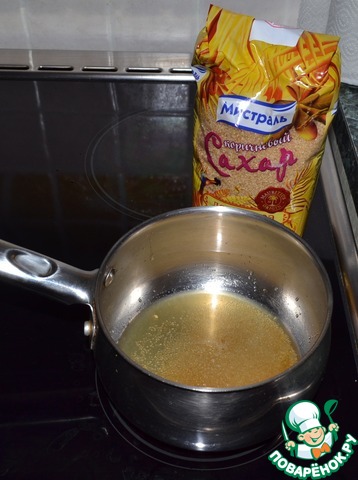 7. Теперь можно приготовить карамель. Коричневый сахар соединяем с апельсиновым соком и увариваем до загустения. Поначалу карамель будет бурно кипеть, но по мере загустения этот процесс замедлится. Не отходите от сотейника и непрерывно мешайте. Карамель будет готова тогда, когда при выливании в холодную воду капля становится твердым шариком. Не переварите карамель и будьте предельно осторожны!!!