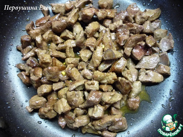Обжариваем на сковороде с раскаленным маслом буквально пол минуты. Нам нужно чтобы печенка покрылась корочкой и при использовании ее в слойках, жидкость не вытекала и сама она была мягкой.