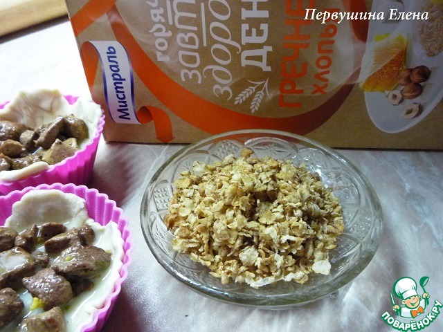 | Горячие слойки с начинкой из печени и омлета, присыпанные гречневыми хлопьями - очень вкусные и сытные, что важно для полноценного завтрака. Можно взять с собой на работу, так как хороши и в холодном виде тоже. Отличное сочетание печени и гречневых хлопьев! |