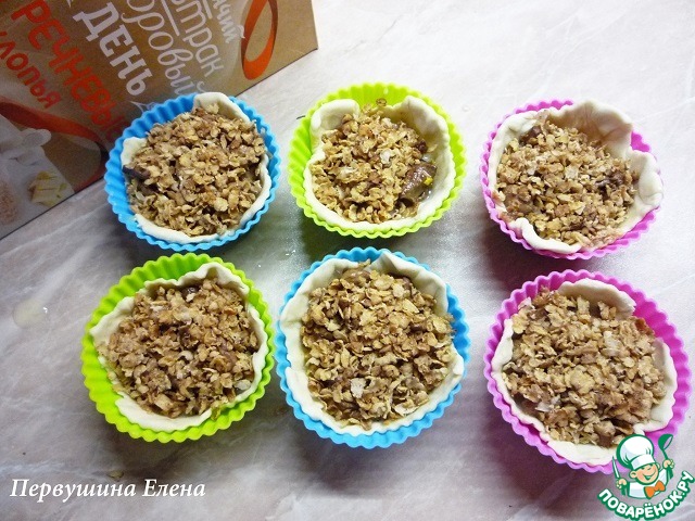 Сверху слойки посыпаем хлопьями до самого верха корзинок из теста. Получится, что половина хлопьев намокнет, а половина останется сухой, что нам и нужно.