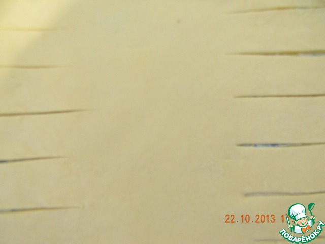 Тесто раскатываем вдвое в прямоугольник. Дальше нарежьте края теста на тонкие полоски.
