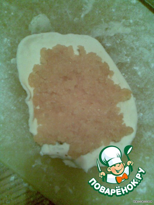 Раскатываем тесто на овалы... и выкладываем прокрученную курагу...