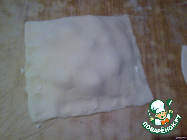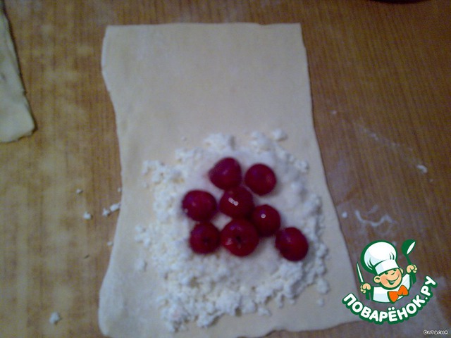 Тесто раскатать, разделить на прямоугольники. На одну половинку положить творог, посыпать сахаром, поверх выложить несколько ягод вишни без косточек.