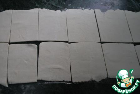 6. Раскатываем слоеное тесто, чтобы оно было толщиной 3 мм. И нарезаем его на квадраты.