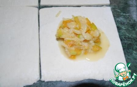 7. В центр каждого квадрата кладем начинку и защипываем края по типу хинкали. Должен получиться симпатичный мешочек с хвостиком.