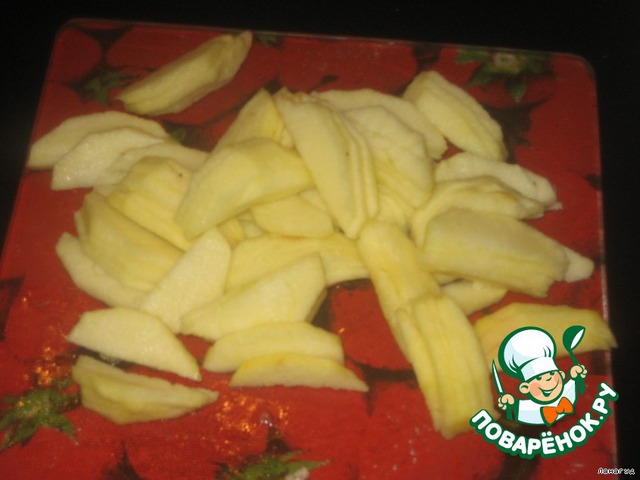 Яблоки очистьть, удалить серединку и нарезать тонкими ломтиками.