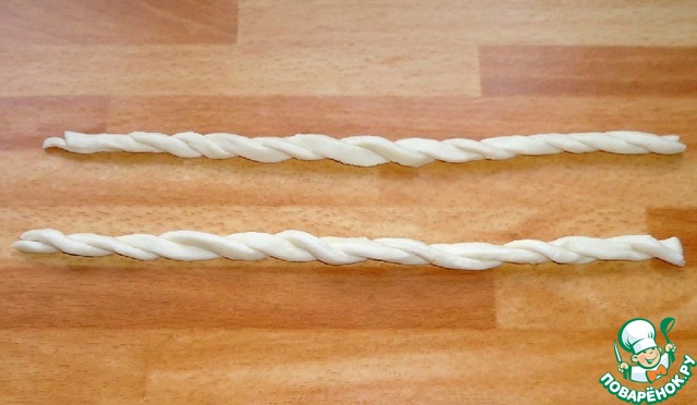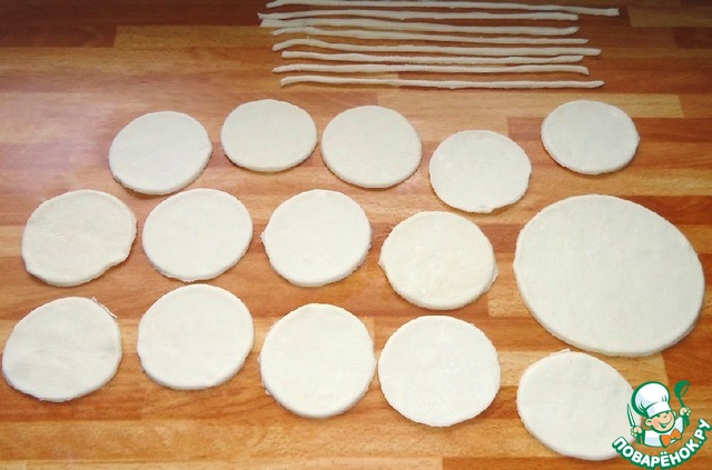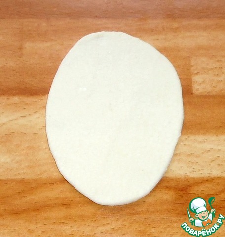 Круги из теста меньшим диаметром чуть раскатать в виде овала.
