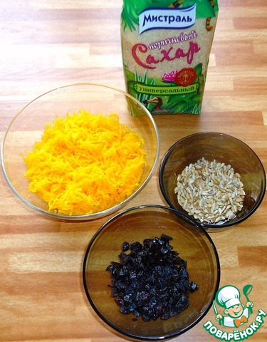 Для начинки тыкву (или яблоки) очистить от кожуры и семян, натереть на средней тёрке, изюм или чернослив (у меня был и изюм и чернослив) промыть, залить кипятком, оставить на 10-15 минут, затем слить воду и мелко нарезать чернослив, семечки подсолнуха слегка обжарить на сухой сковороде и очистить. Для приготовления слоек я использовала универсальный коричневый сахар ТМ "Мистраль".