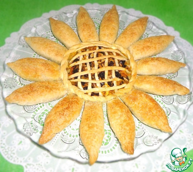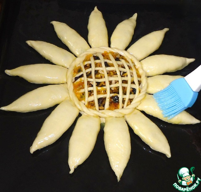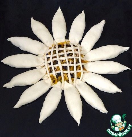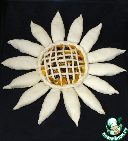 Пирожки - слойки выложить на противень в виде лепестков подсолнуха.