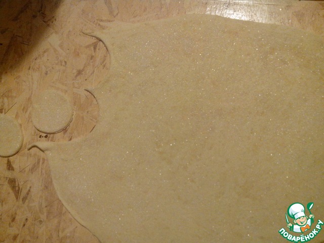 Посыпаем наш пласт сахаром и прикатываем скалкой. это тесто как вы заметили не сладкое. поэтому можно брать вместо сахара так же кунжут, орешки, семечки... в общем на любителя. после посыпки вырезаем формочкой (я использовала стакан)