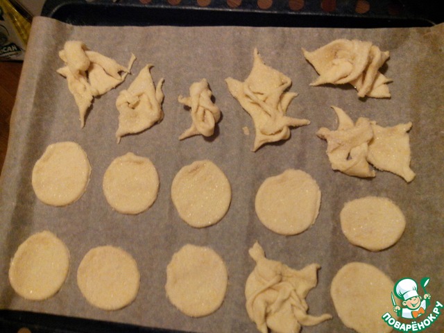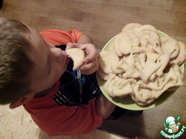 И вот наши печеньки готовы!!! его выходит очень много, я естественно не стала все фотографировать)))мой помощник ждал их с не терпеньем))съедаются быстро, печенье получается слоеное и очень легкое!