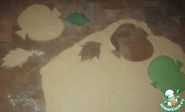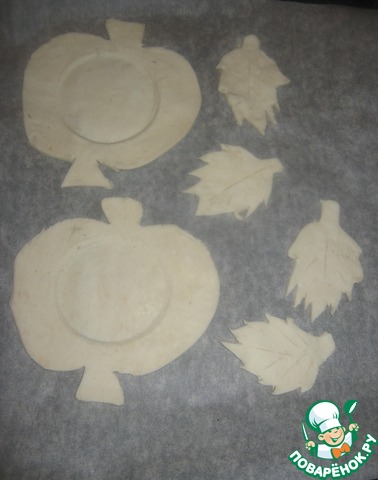 Выкладываем на противень, застеленный пекарской бумагой, слегка выдавливаем в яблоках в центре круг