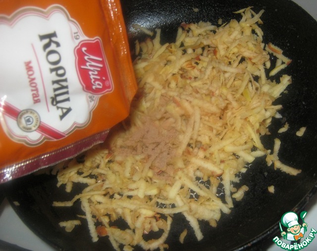 Яблоки пересыпаем сахаром и корицей, протушиваем на сливочном масле