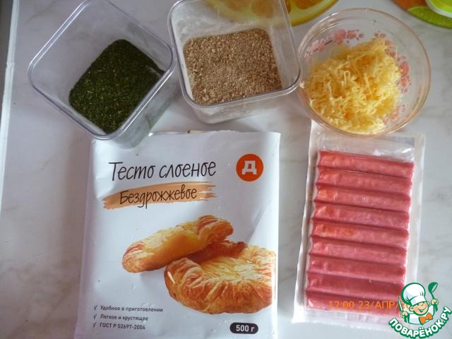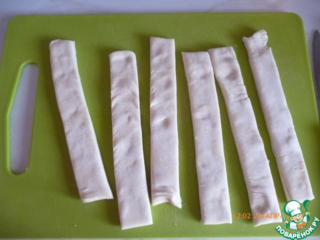 Разрезаем, размороженное при комнатной температуре, тесто на полоски.