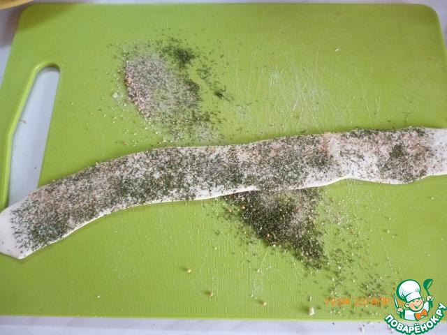 Раскатываем на смеси трав и специй. Так, чтобы специи остались на тесте.