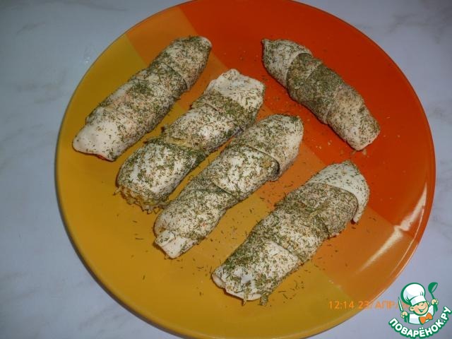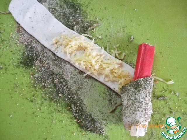 Кладем на край крабовую палочку, сыр. Закручиваем, по мере закручивания кладем натертый сыр.
