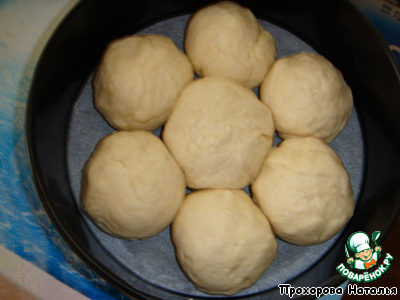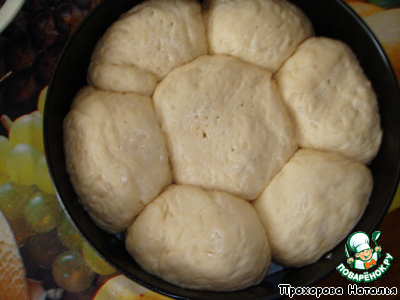 Сформировать колобки, положить их в разъемную форму (у меня диаметром 22 см) плотно друг к другу в виде ромашки. И оставить подходить в теплом месте на 30-40 минут. Тесто снова должно увеличиться в 2 раза.