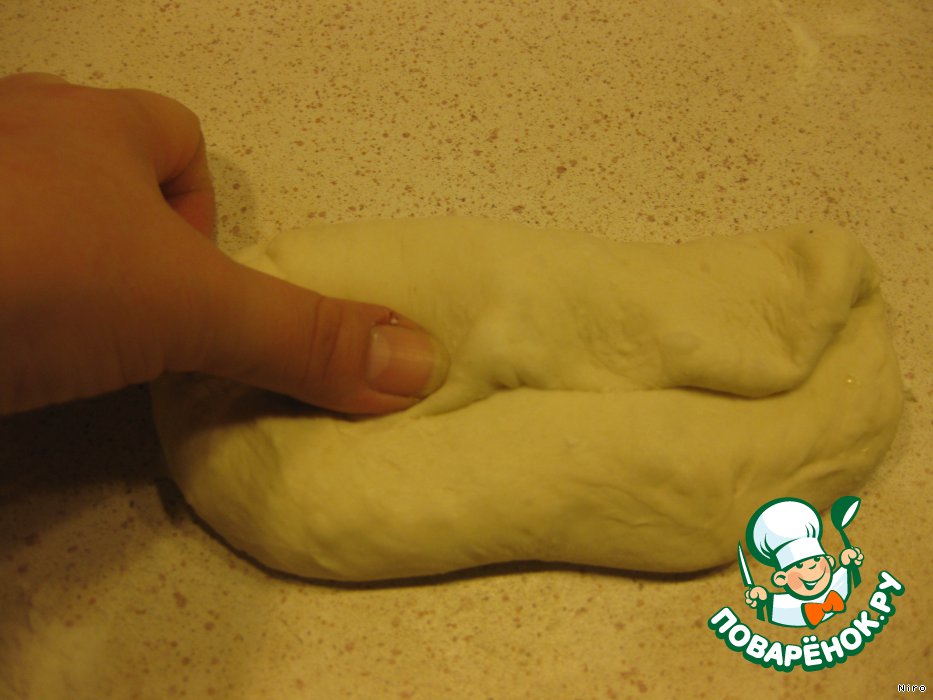 Пять минут прошло — за дело! Если надо, подсыпаем муки на стол. Берем один из тестяных шаров, укладываем «на спинку», гладкой стороной вниз и основанием ладони разглаживаем в условно овал.
