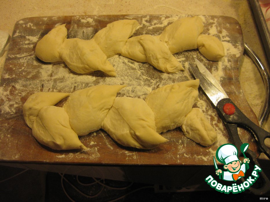 Другое дело эпи. Перед тем, как уложить их баиньки, придадим им форму колоска. Берем дубинку, которой уже не судьба стать багетом, и безжалостно надрезаем ее ножницами под углом 45 градусов на ¾ толщины.