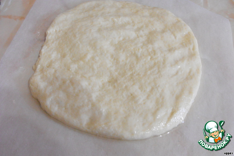 Вымесить еще раз поднявшееся тесто, раскатать толщиной в 1,5-2 см и выложить на смазанный маслом противень или пергамент.