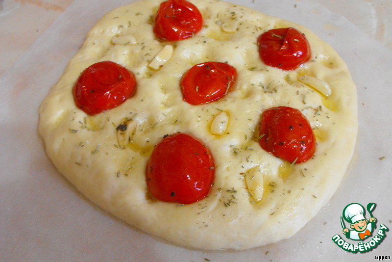 Смазать при помощи кисточки оливковым маслом фокаччу, сделать пальцами углубления по всей фокачче, выложить сверху помидоры и дольки чеснока (по желанию), посыпать крупной солью.