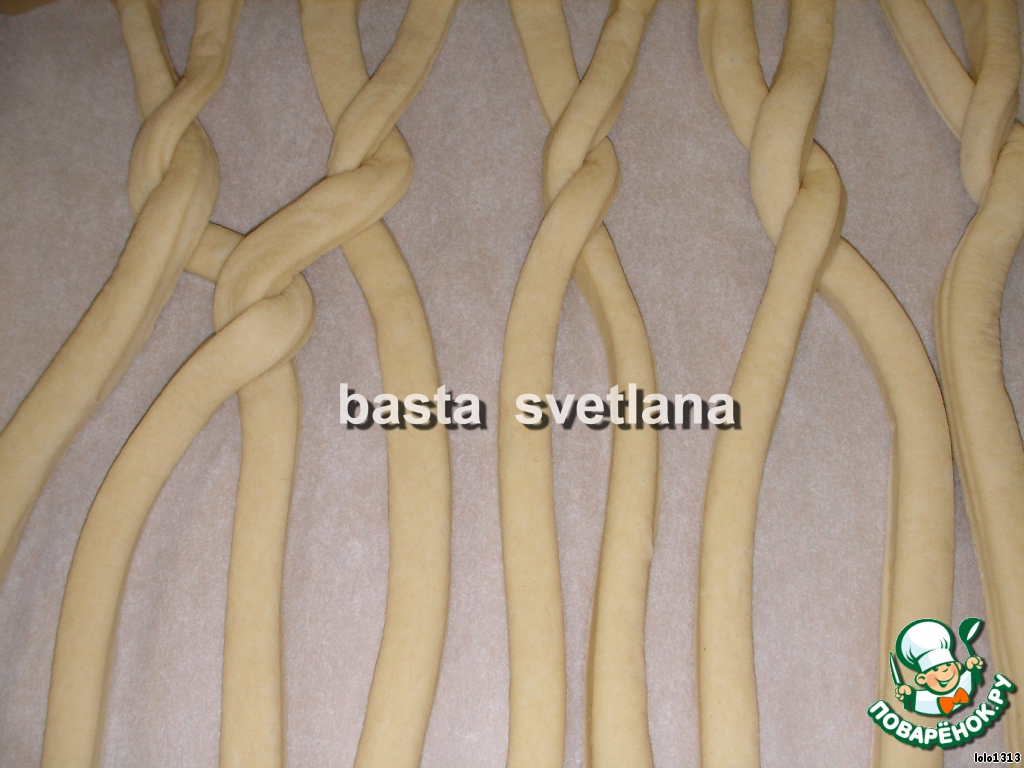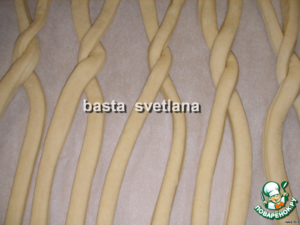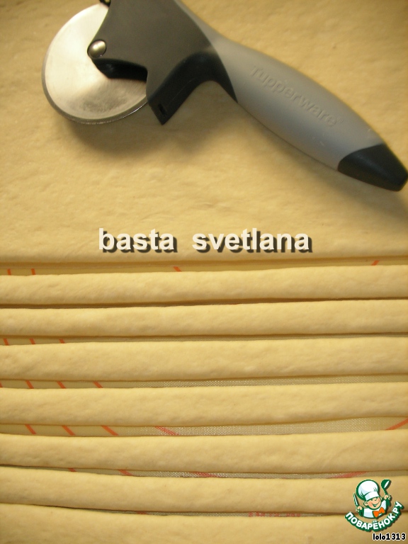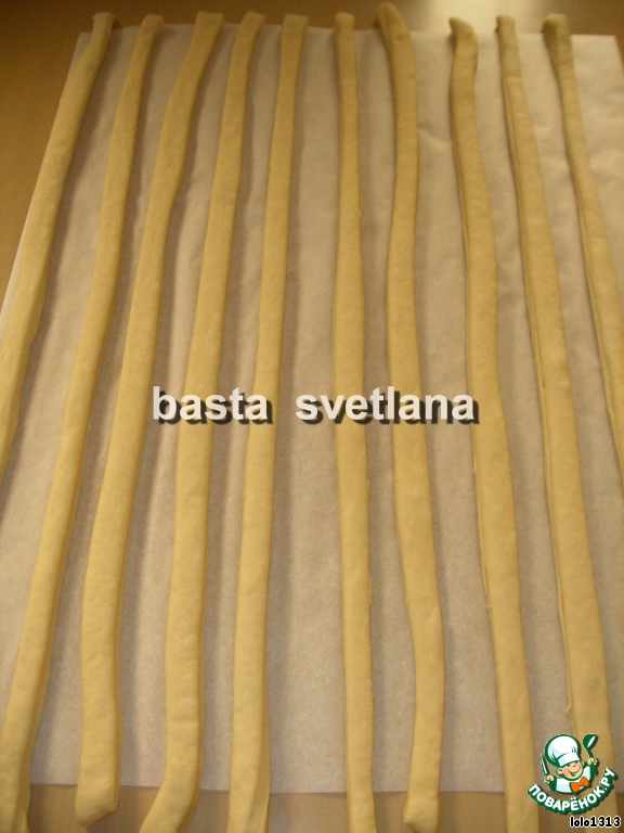 Тесто раскатать в пласт и разрезать его на длинные жгуты.