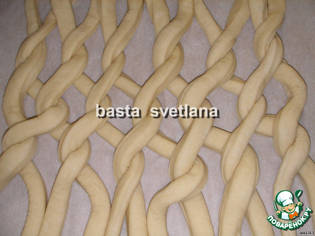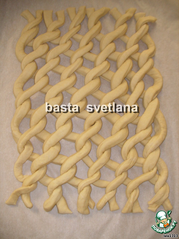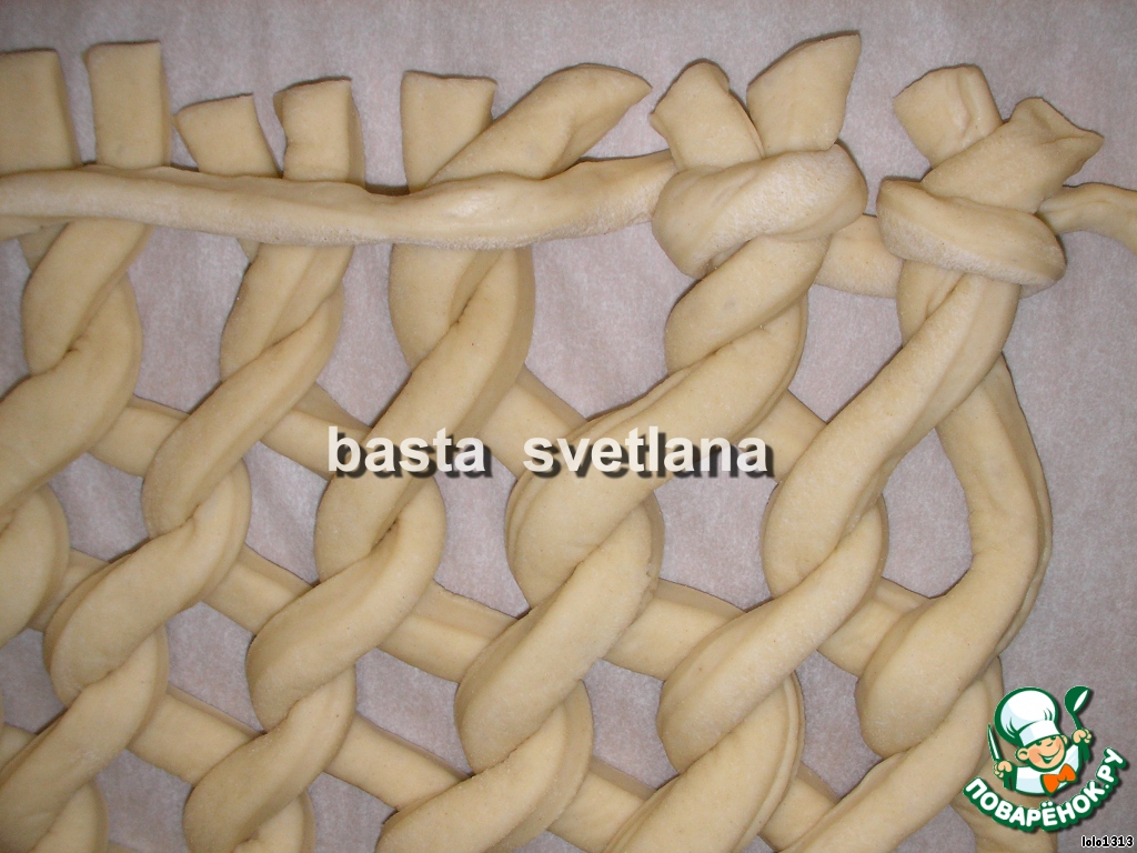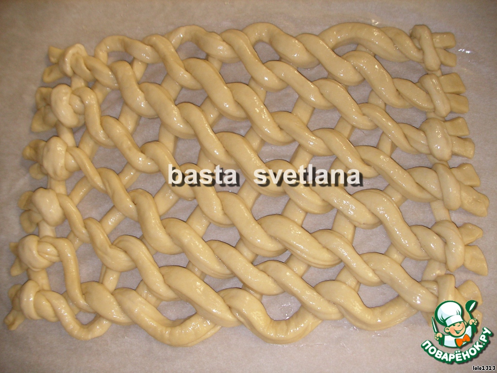 Готовую сеточку смазать яичным белком с небольшим количеством воды (или можно просто смазать смоченной в воде кисточкой).