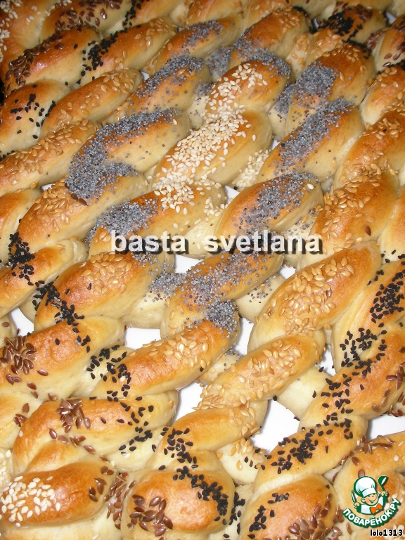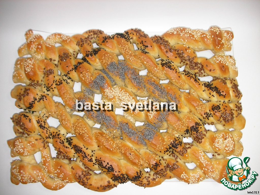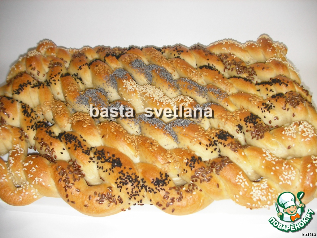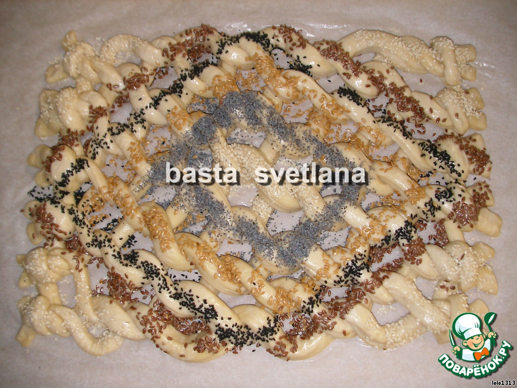 | Отправила я мужа с сыном к детскому врачу на очередной приeм. И после приeма (у нас всe хорошо) оказались мои мужчины в магазине с коврами. Уж как их туда занесло, я не знаю, но по возвращении только и было разговоров о ковре, который им очень понравился. Они так дружно рассказывали какой он красивый , большой, толстый, сколько в нeм узлов и сколько разных цветов, что мне пришлось согласиться поехать на следующий день смотреть чудо-ковeр. И конечно, пришлось согласиться с покупкой, хотя надо было решать совсем другие вопросы. И мало того, я на следующий день испекла хлебный ковeр... вот, такая история рецепта получилась. |