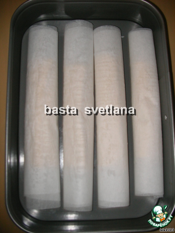 Каждый батончик завернуть в небольшой кусок пергаментной бумаги, тоже трубочкой так, чтобы края оставались свободными.
