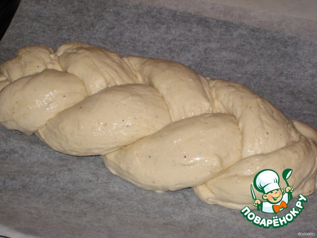 Руки немного смазать растительным маслом, из каждой части скатать колбаску, затем из этих трех колбасок сплести косу, которую выложить на противень.