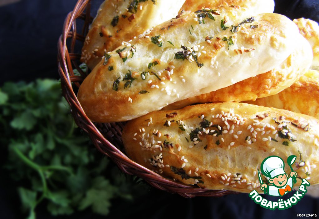 В расстоявшихся булочках сделать продольный развез и в половину багетиков выложить масляно-чесночную массу, оставшиеся булочки посыпать сыром.