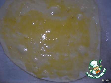 Выкладываем лепешку на противень и обильно смазываем ее маслом.