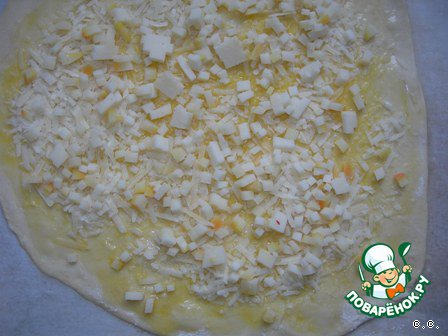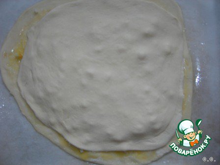 Снова смазываем маслом и посыпаем сыром. Так повторяем и с третьей лепешкой. Накрываем четвертой лепешкой и тщательно защипываем края.
