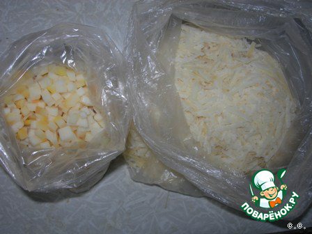 Сыр порежем мелкими кубиками. Я использовала 2 вида - пармезан и твердый козий.