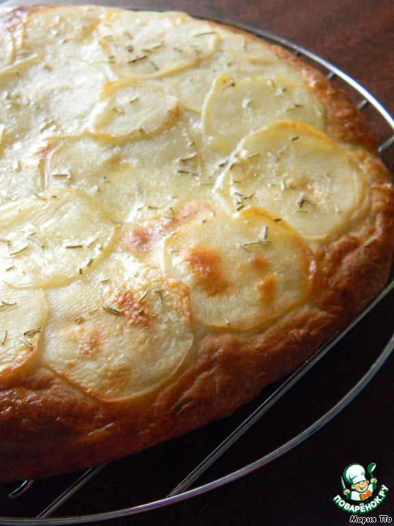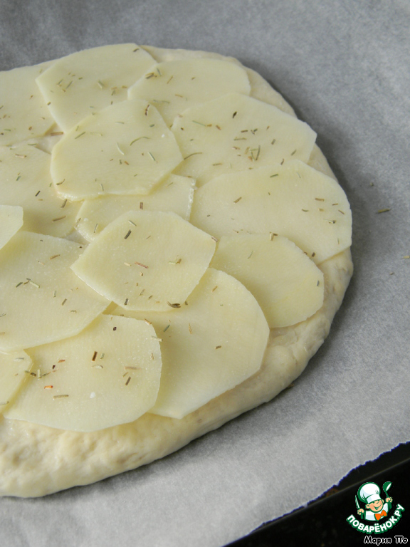 Слегка смазать маслом. Сверху выложить кружочки картофеля. Снова смазать маслом, посыпать розмарином и солью (в идеале - крупной).