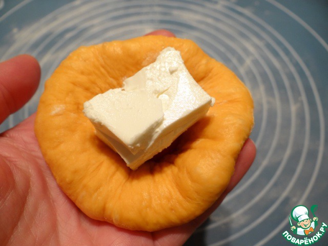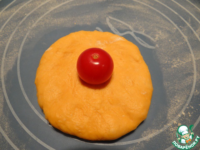 Беру один шар теста, чуть раскатываю его, на середину кладу один помидор черри.