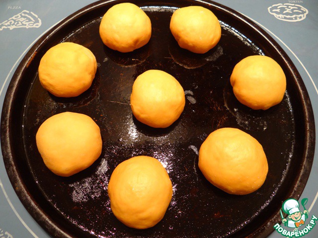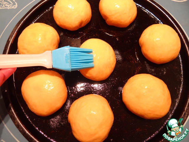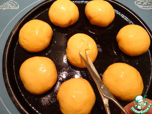 Противень смазываю маслом, перекладываю на него заготовки, накрываю пленкой и даю изделиям увеличиться в объеме в 1,5-2 раза.