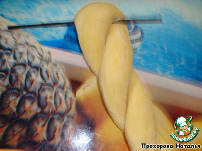 Сложить веретено пополам, накинув его на палочку и скрутить жгутом. Тоже самое сделать и со второй частью теста.