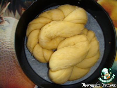 Уложить скрученные жгуты в разъемную форму (рекомендовано было диаметром 26 см, я же использовала 22 см, она просто получилась выше) толстой головкой в центр зацепом и подоткнуть тонкие концы по окружности.