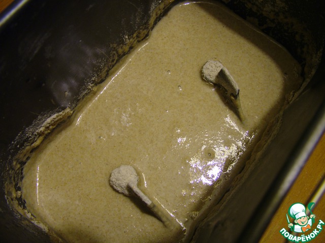 Для теста соедините опару с 250 граммами солода. Подсолите, если не любите пресный хлеб, вымесите несколько минут. Если будете печь хлеб в форме, тогда тесто можно сделать помягче - добавьте дополнительно 50-100 г воды, оно и поднимется лучше.