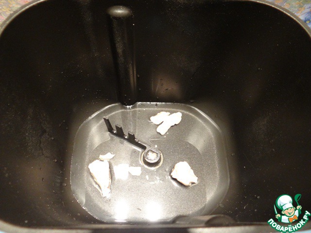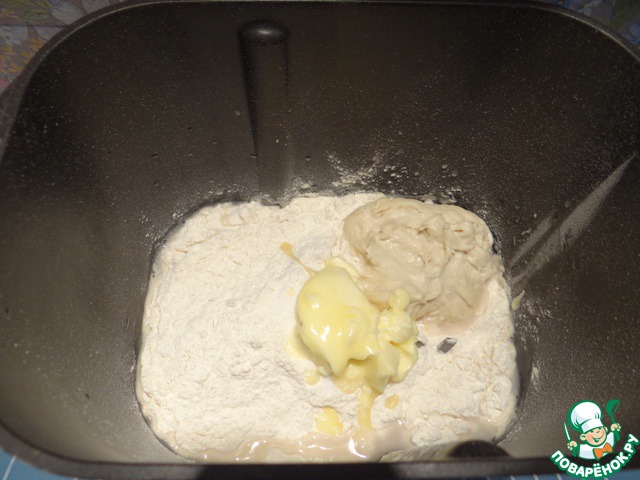 Через 8-10 часов замешиваем тесто. Я замешиваю дрожжевое тесто с помощью хлебопечки, но можно замесить тесто и обычным способом. В ведерко хлебопечки наливаем теплую воду, добавляем сырые дрожжи, оставляем минут на 5-10.